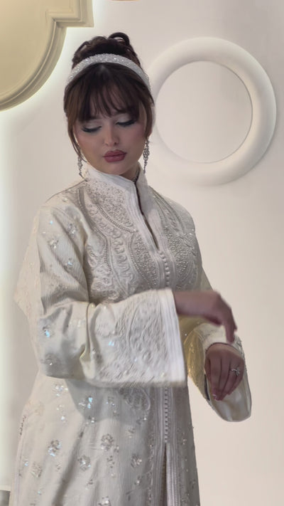 Elyana is crafted for the bride who doesn’t ask for permission to shine — she simply does. Draped in luminous ivory, the fabric reveals a delicate raised pattern, enriched with pearl embroidery and hand-applied sequins. Its symmetrical composition embraces the silhouette with grace and quiet confidence.